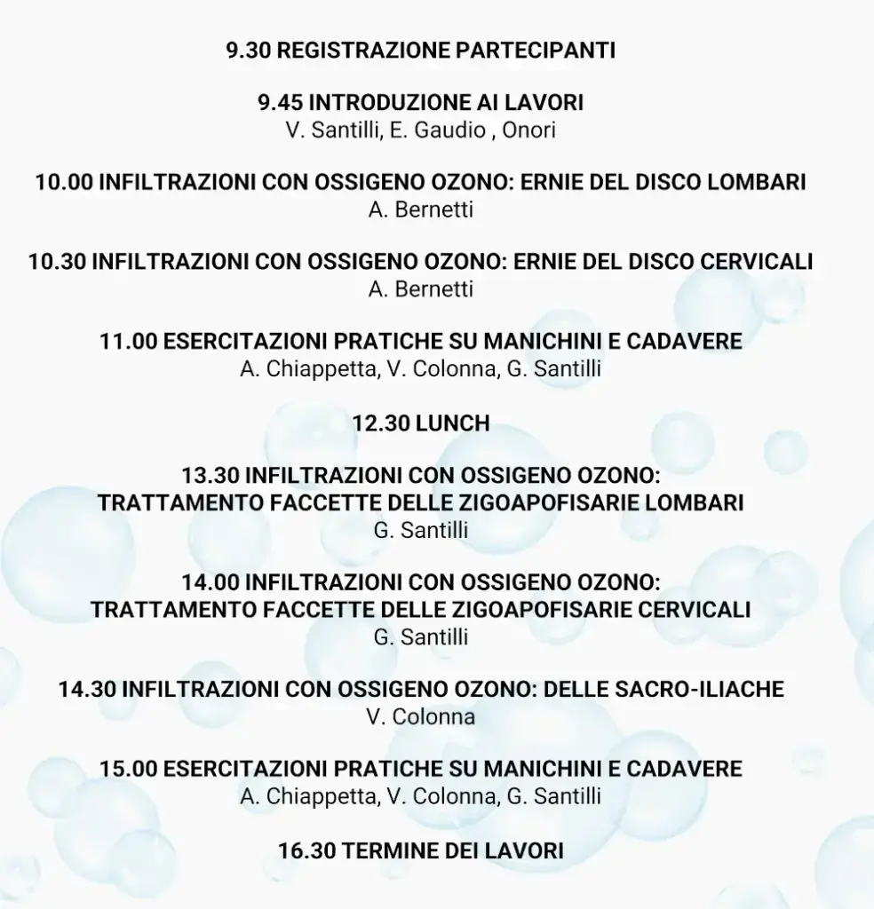 Il programma si concentra sulle infiltrazioni con ossigeno-ozono nel trattamento delle ernie del disco lombari e cervicali, delle faccette zigoapofisarie lombari e cervicali e delle articolazioni sacro-iliache. Ampio spazio è dedicato alle esercitazioni pratiche su manichini e cadavere, elemento centrale del percorso formativo, che consente di consolidare l’apprendimento delle tecniche in un setting realistico e ad alto valore didattico. La struttura del corso favorisce così l’integrazione tra teoria e pratica, con l’obiettivo di rafforzare competenze cliniche e sicurezza operativa nell’ambito delle procedure infiltrative avanzate.