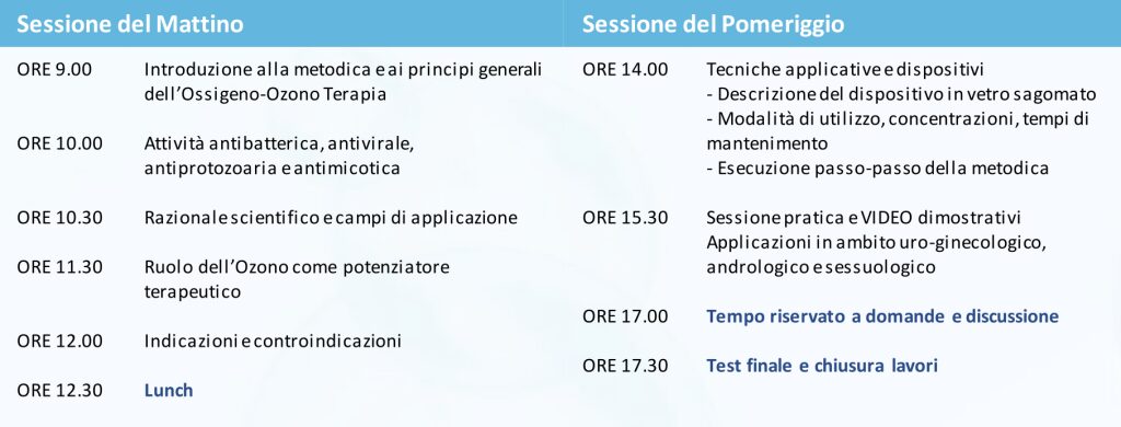 Il programma affronta i principi generali della metodica, analizzando l’attività antibatterica, antivirale, antiprotozoaria e antimicotica dell’ozono e il relativo razionale scientifico. Particolare attenzione è dedicata al ruolo dell’ozono come potenziatore terapeutico, alle indicazioni e controindicazioni, fino alle tecniche applicative con descrizione dettagliata dei dispositivi, delle modalità di utilizzo e delle corrette concentrazioni. La formazione si completa con una sessione pratica supportata da video dimostrativi, dedicata alle applicazioni in ambito uro-ginecologico, andrologico e sessuologico, seguita da un ampio spazio per domande e discussione.